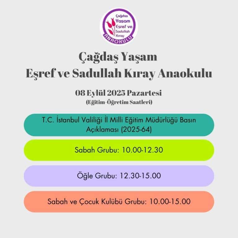 Çağdaş Yaşam Eşref ve Sadullah Kıray Anaokulu 08 /09/2025 Pazartesi günü eğitim öğretim saat planlaması,